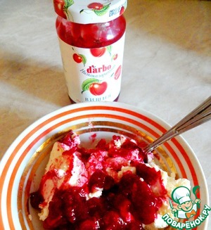 • В это время готовим начинку. Смешать творог с вишневым низкокалорийным конфитюром D’arbo и йогуртом.