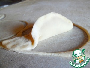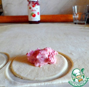 • Тесто раскатать в тонкий пласт. Вырезать стаканом кружочки. Положить на середину творожную начинку.