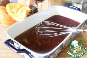 Для маринада смешать в жаропрочной форме вино, соевый соус, оливковое масло и сок одного апельсина. Ввести мед и хорошо распустить его в жидкости, чтобы он не оседал на дно.