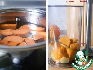 *В этот раз я делаю крокеты из сладкого картофеля - батата. Очищенный батат отварить около 10 минут после закипания до мягкости. Пюрировать вместе с цедрой апельсина и кусочком имбиря (1см). Заправить солью и перцем по вкусу. -