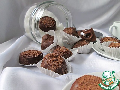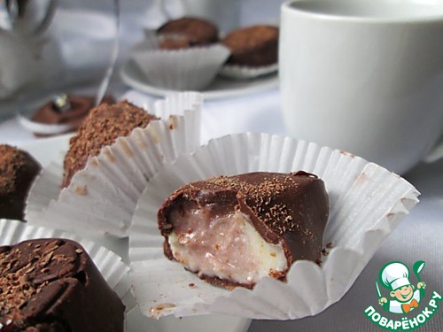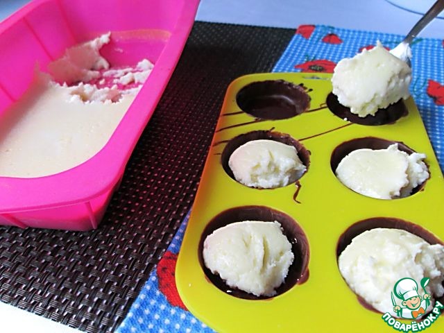 Остаток растопленного шоколада наносим на творожную начинку, ставим формочку в холодильник. Первый вариант конфет готов.