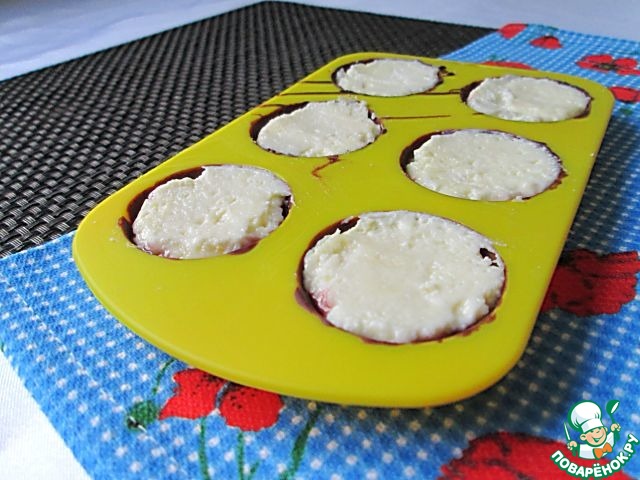 Когда шоколадный слой застынет, выкладываем в каждую ячейку по 1/2 ч. л. конфитюра и по 1 ч. л. чизкейковой начинки.