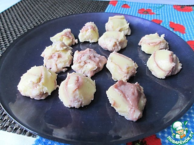 Для второго варианта малиново-ванильный чизкейк делим на 10-12 частей ножом или делаем шарики ложкой для мороженого. Убираем на некоторое время в морозильник, чтобы они подморозились. Так будет удобнее покрывать их шоколадной глазурью.
