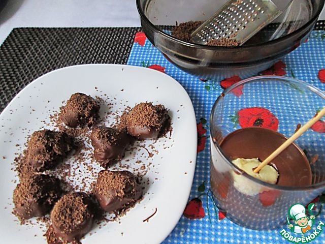 Растапливаем вторую половину шоколада, даем ей немного подостыть. Погружаем каждый шарик в шоколад, таким образом, чтобы он равномерно покрылся глазурью со всех сторон. Шоколад очень быстро застывает на холодной поверхности чизкейка. Можете по желанию украсить готовые конфеты шоколадной стружкой, какао-порошком или молотыми орешками.