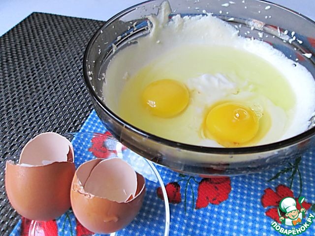 Добавляем йогурт, крахмал и яйца, смешиваем миксером на минимальной скорости до гладкой консистенции.