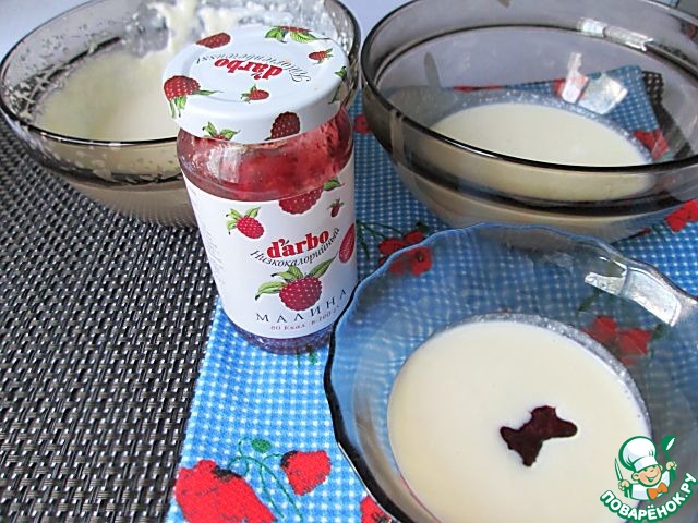 Делим тесто на две равные части, три ст. ложки от одной из частей смешиваем с малиновым конфитюром D’arbo, перед этим процеженным сквозь сито.
