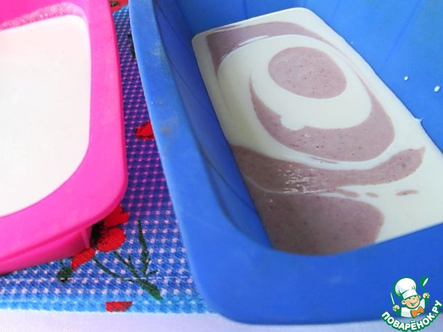 Выливаем две половины теста в две разные формы для выпекания. Двухцветную половину теста выливаем в форму по одной столовой ложке, чередуя цвета между собой. Затем вилочкой аккуратно проводим по тесту, рисуя красивые разводы. Выпекаем 40 минут при температуре 160 градусов Цельсия. Чизкейк будет готов, когда его края схватятся, а серединка будет немного подрагивать. Готовый чизкейк вынимаем его духовки, охлаждаем и убираем на несколько часов в холодильник.