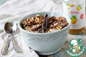 Смешать овсяную смесь с абрикосовым конфитюром D’arbo и выложить полученную смесь в жаропрочную форму для запекания. Положить палочку корицы и соскоблить семена ванили.