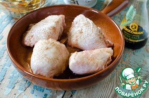 Куриные бедрышки вымыть, обсушить и положить их в жаропрочную форму. Полить их 2 ст. л. соевого соуса, поперчить и оставить на 30 минут.