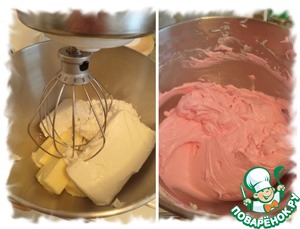 Теперь займёмся кремом для декорирования. 350 г сливочного масла и 400 г сливочного сыра комнатной температуры взбить миксером до однородного состояния, продолжая взбивать добавить 100 г сахарной пудры. Теперь по чуть чуть пищевой краситель до желаемого цвета.