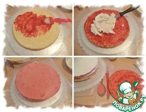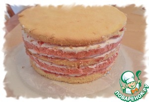 Начинаем сборку торта. Каждый корж перевернуть, снять бумагу и смазать клубничным пюре (так же не забудьте снять бумагу и с суфле). Сверху на пюре намазываем крем, теперь выкладываем первый круг суфле. На суфле опять крем и накрываем вторым коржом, смазанной стороной вниз. Повторяем процедуру ещё раз : клубничное пюре, крем, второе суфле, крем и последний корж смазанной стороной вниз.