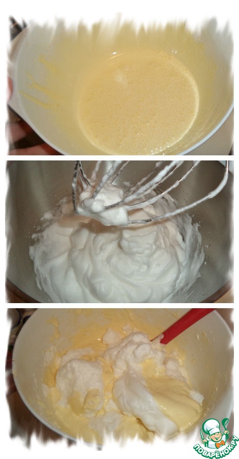 Муку соединить с крахмалом и солью, просеять. В отдельной посуде взбить белки до устойчивых пиков. Белки аккуратно выложить к желткам, добавить просеянную муку с крахмалом и лопаточкой мешая снизу вверх довести массу до однородного состояния. -