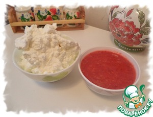 Разделить массу на две равные части. Две формы такого же диаметра как и для коржей (у меня 21 см) застелить пергаментной бумагой. Вылить суфле и поставить на ночь в холодильник.