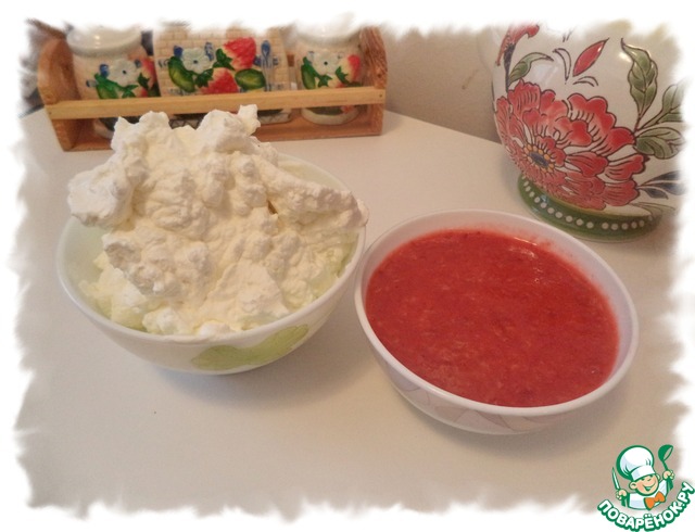 300 мл сливок взбить до плотного состояни, продолжая взбивать добавить 50 г сахарной пудры