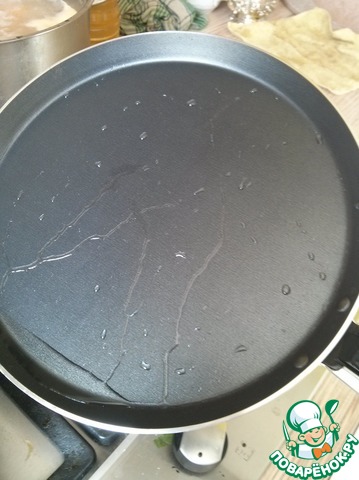 Наливаем на блинную сковороду подсолнечное масло (немного для смазки), хорошо разогреваем. Лишнее масло можно вылить в тесто.