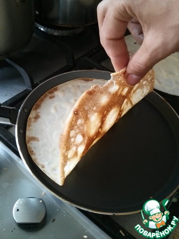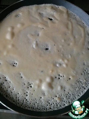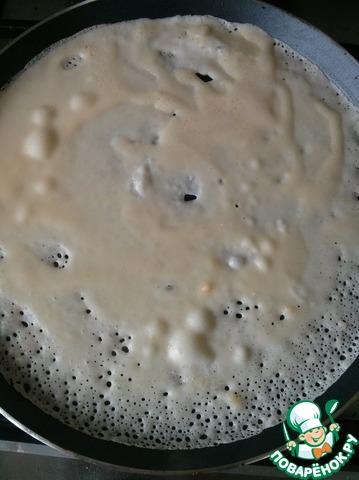 Берём разогретую сковороду за ручку и наливаем тесто, равномерно распределяя его по поверхности, так чтобы получился очень тонкий слой. Стараемся не оставлять дыр, т. к. будет пригорать.