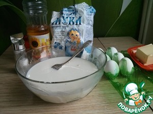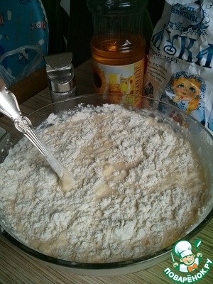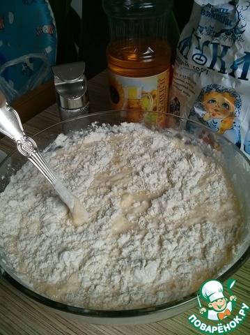 Постепенно добавляем муку, взбивая все миксером ( можно вилкой). Добавляем масло подсолнечное, соль.