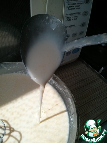 Тесто получается достаточно жидкое. Если хотим сладкие блинчики, добавляем сахар и хорошо размешиваем.