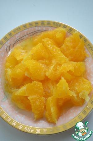 Апельсин очистить (по возможности ) от кожицы и белых пленок. Нарезать мелкими кубиками, удалив косточки, выложить в миску, залить ликером