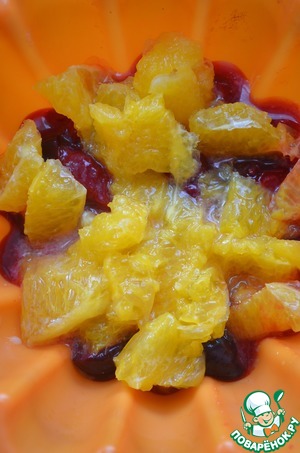 Выделившийся сок собрать, добавить в него готовый апельсиновый сок, чтобы получился 0,5 ст. Половину желатина 5г залить холодной водой 2ст. л, оставить для набухания, после распустить на водяной бане, добавить апельсиновый сок. Вишню с конфитюром выложить на дно формочки, сверху измельченный апельсин