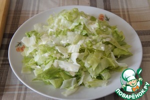 • Сыр нарезать небольшими кубиками. Листья салата нарезать лапшой, лучше сделать это керамическим ножом, или нарвать руками.
