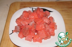 Семгу (кету или форель) разделать на филе и нарезать крупными кубиками.