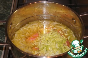 Влить рыбный бульон, оставить на самом маленьком огне, какой только возможен.