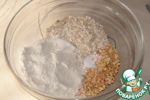 Смешать геркулес, муку, орехи (у меня миндаль, обжаренный и нарезанный на кусочки, но можно взять любые) и соду.