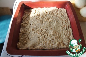 Замесить тесто. Слегка смазать форму маслом и выложить тесто, проткнуть в нескольких местах вилкой.