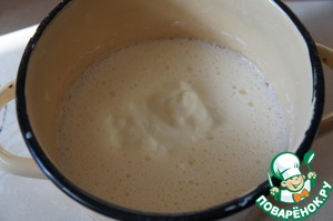 Всыпать сахар и постепенно влить молоко и масло. Сахар можно заменить на мед, вкус у пирога будет другой.