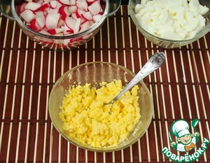 Соединить редис, белок, нарезанный зелёный лук и заправку.