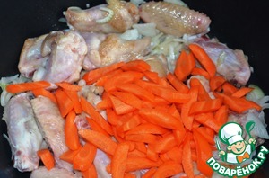 • Морковь почистить и нарезать брусочками, немного обжарить.