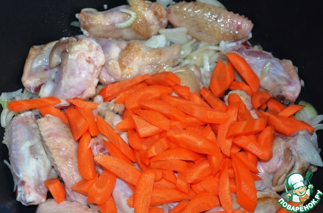 • Крылышки помыть, почистить и обжарить немного в небольшом количестве оливкового масла. Добавить почищенный и нарезанный, четвертинками лук.