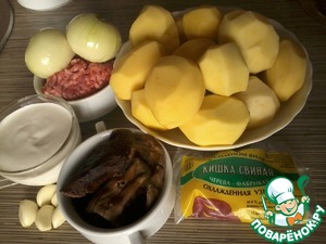 Начну с того, что на сайте есть подобные рецепты, но только подобные! Мой же, сделан по мотивам белорусской кухни а именно "бульбяной кишки" с некоторыми моими включениями) Кроме того, я представлю вам сразу два варианта колбасок, ибо делить их на два отдельных рецепта нет смысла, они очень просты и если уж я готовлю бульбяные, то и обязательно делаю и печеночные, правда какой из них уделить больше внимания было для меня задачей! Ведь каждая вкусна по своему. Я тянула спички) и в приоритете оказалась бульбяная! Ну чтож, начнем! И начнем мы с самого главного, оболочки наших колбасок, коей являются чрева свиные а по простому кишки. У нас эти штуки продаются уже в готовом к реализации виде, но если у вас такого чуда в магазинах нет, то вероятность раздобыть их в мясной лавке или на рынке очень даже велика! Вот наш набор продуктов, кстати грибы можно заменить на любые другие, свежие шампиньоны например, их можно не крупно порезать и прямо сырыми добавить в фарш для колбасок, будет ну очень вкусно!