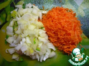 • Лук нарезаем кубиками, морковь натираем на крупной терке. Делаем зажарку.