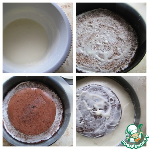 Для приготовления шоколадно-сливочного слоя 200 г шоко поломать на кусочки, залить 100 мл сливок, нагреть при постоянном помешивании до полного растворения. 8 г желатина залить 50 мл кипяченной воды или сливок, дать набухнуть и растворить на водяной бане. 250 мл сливок взбить до мягких пиков, добавить растворенный и слегка остывший шоколад, перемешать до однородности, влить растворенный желатин, перемешать. В форме d=16 см со съемными стенками застелить плотным "файлом" дно и боковинки, вылить шоколадно-сливочную смесь, отправить в холодильник до полного застывания.