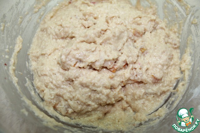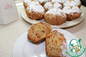 Муку, сахар (я брала меньше т. к не люблю сильно сладкое), разрыхлитель, корицу и курагу смешиваем в большой миске