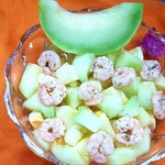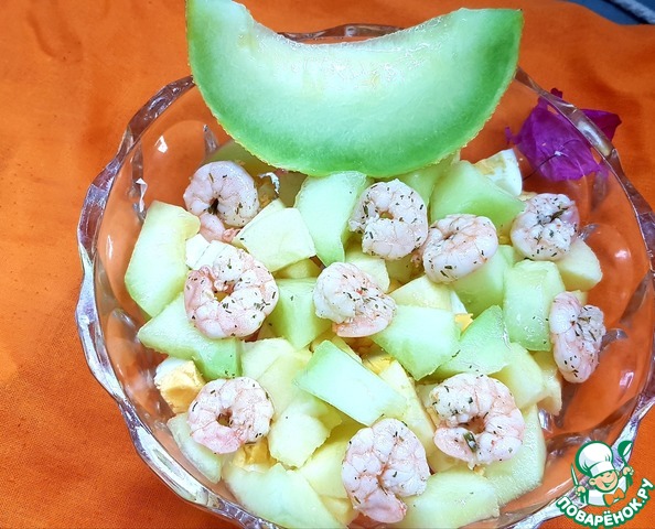 Дыню порезать и смешать с креветками, яйцами и яблоком.