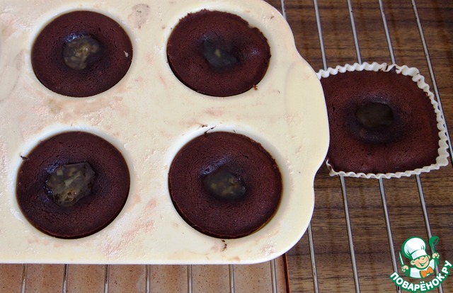 Разогреть духовку до 190 градусов. Достать из морозилки формы с замороженными пирожными и прямиком поставить в духовку на 15-18 минут. Время зависит от вашей духовки и от того насколько жидкую серединку вы хотите получить.
