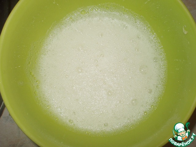 Взбить белки в некрепкую пену венчиком. Добавить сахар (Если Вы делаете запеканку для взрослых, то сахара можно положить в 1,5-2 раза больше. Либо оставить так, а потом можно полить вареньем сверху или сгущёнкой ( как у меня на фотографии)).