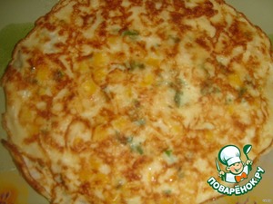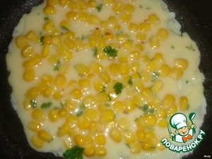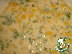 Для лепешек необходимо насыпать в емкость крахмал, добавить чили, немного соли и рубленную зелень петрушки. Вбить яйца и все хорошо перемешать. Влить молоко и ввести кукурузу. Отставить на 10 минут.