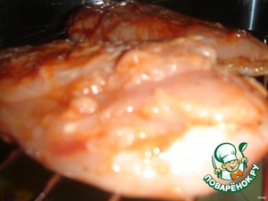 Пришло время куриных грудок. Их необходимо смазать смесью кетчупа и растительного масла и отправить на разогретый гриль. С каждой стороны обжаривать по 5 минут. Если нет гриля, можно запечь в духовке.