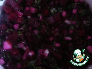 Для гарнира смешать порезанную кубиками свеклу, лук (у меня он оказался красным только снаружи:) видимо, не тот сорт взяла), очищенный от семян и мелко порезанный чили, петрушку. Слегка присолить, поперчить и заправить смесью из 2 ст.л. уксуса и 2 ст.л. масла. Все перемешать и отправить в холодильник охлаждаться. -
