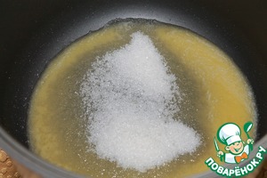Подготавливаем все необходимые продукты. Выбираем программу выпечка и минимальное время, у меня это 20 минут. В разогретой чаше при открытой крышке растапливаем столовую ложку сливочного масла. И по дну чаши рассыпаем 3 ст. ложки сахара.