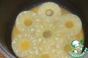 Выкладываем ананасы по кругу сколько вместится в Вашу чашу. Закрываем крышку на 10 минут. Можете меньше, если знаете, что Ваша мультиварка немного подзажаривает. Делается это для того, чтобы карамелизовать ананасы. Даже если в конце выпечки они у Вас получатся немного подгоревшие на вкус это не влияет. Получается даже лучше. Если не хотите их карамелизовать, то просто выложите ананасы.