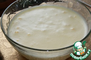 Яйца взбиваем как минимум 7 - 10 минут. Это очень важно и влияет на высоту и вкус Вашего пирога. После чего к яйцам не переставая взбивать добавляем постепенно сахар, взбиваем еще несколько минут.