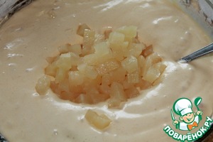 Оставшиеся в банке ананасы произвольно нарежьте и добавьте к тесту, все перемешайте. Если делаете пирог с яблоками, то нарежьте кусочки яблок.