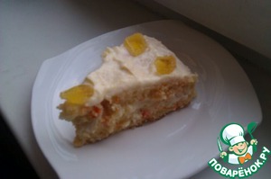 2 яйца взбить с 1 ст. сахара, добавить пачку растопленного масла, стакан тертой моркови, муку, разрыхлитель. Выпечь два коржа. Или один, после его просто разрезать.