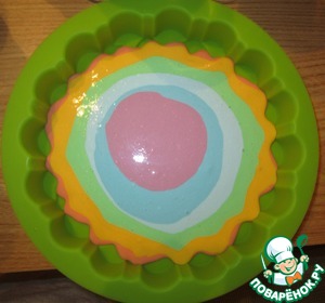 В форму выливаем по очереди строго по серединке по 2 ст. ложки каждого цвета