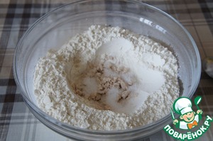 Муку просеять в большую миску, сделать углубление и раскрошить туда дрожжи. Добавить 1 ч. л. сахара.